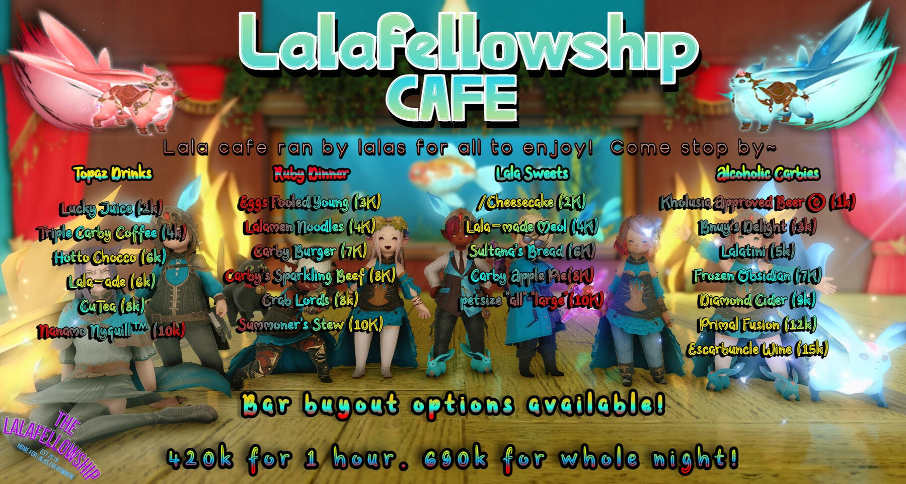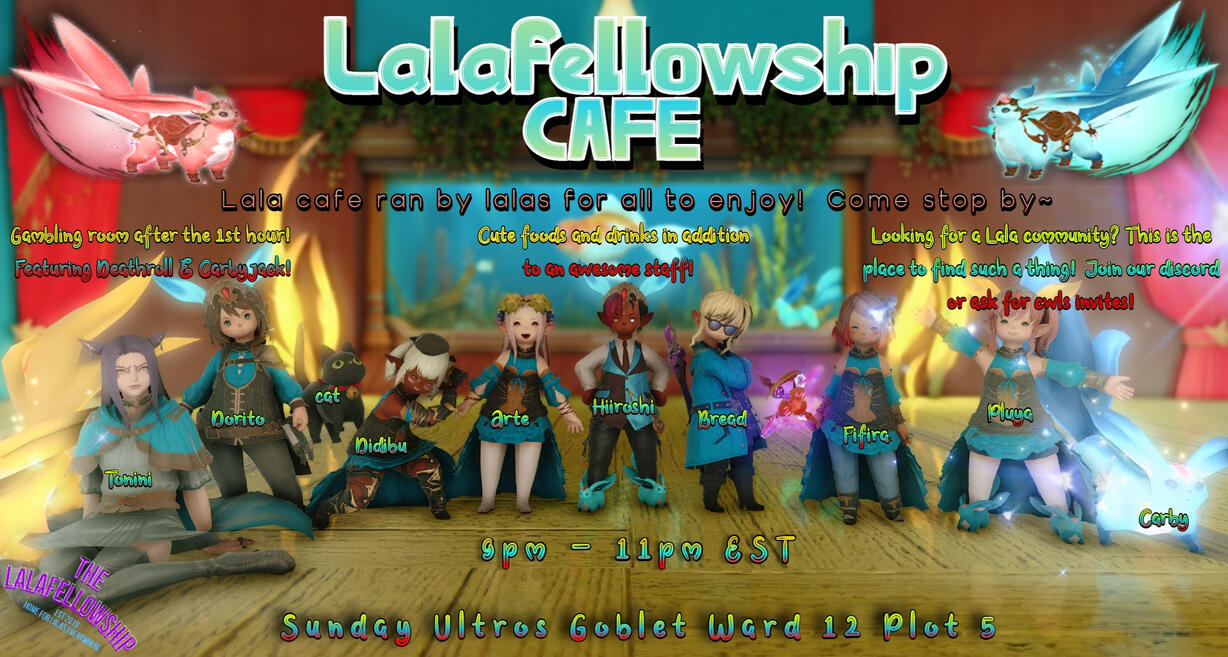 The Lalafellowship Cafe! Cafe ran by Lalas for Lalas and ALL! Cute lalas, carbies, food & drinks and gambling after the hour! Just walk in and take a seat downstairs and a server will attend to you with a menu in hand! Our menus will always be on hand so you can easily read them no matter what type of eyes you may have!Gambling room opens after the first hour (after announcements) and we have 5 games to choose from in which the rules can be explained to you on site! AST Poker, Higher or Lower, Coin Flip, Deathroll, and Carbyjack are all playable in our venue! Each game has a set minimum and maximum bet and bets must be traded before the game begins!We sometimes have theme nights in which we encourage our guest to try their best to fit the theme! Theme nights are announced in advance in the cafe.We offer bar buyout options as well!